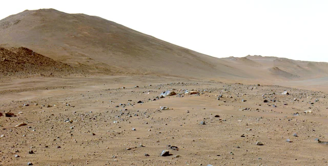 Марсоход Perseverance путешествовал по древнему руслу реки, когда он заснял этот вид области под названием "Яркий Ангел" с помощью одной из своих навигационных камер. Этот регион виден вдалеке справа