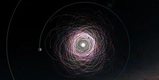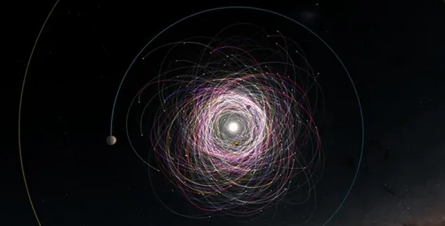Изображение, показывающее орбиты более 150 000 астероидов в Солнечной системе, изученных телескопом Gaia