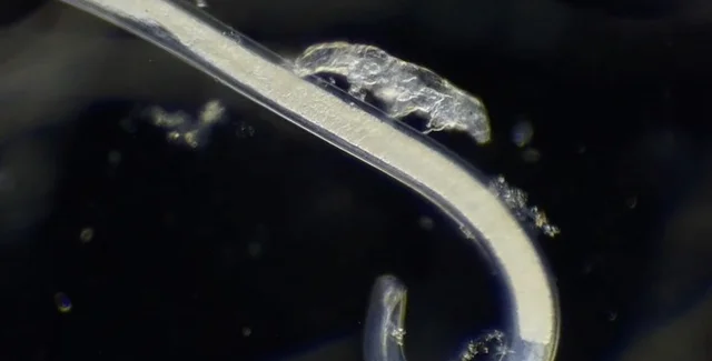 Далее и произошла та самая сцена: один детеныш направился к нематоде, а затем чрезвычайно быстро залез ей на спину. Квинтен отмечает, что использовал для съемки микроскоп Swift 380B, купленный на Amazon, и адаптер, который удерживал камеру iPhone 14 Pro на окуляре микроскопа.