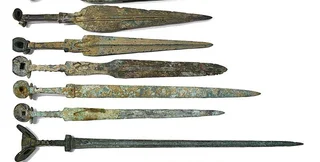 Найденные мечи, модифицированные бронзовыми лезвиями вместо оригинальных железных, классифицируются как "пастиши" — артефакты, собранные из фрагментов древних предметов, чтобы придать им более ценный вид. Такое сокрытие их первоначальной конструкции затрудняет понимание биметаллического оружия той эпохи.