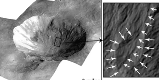 Но изогнутые овраги на Весте, которые имеют толщину в несколько метров, возникли от потоков воды, которые продолжались более часа. Но даже нескольких десятков минут хватит для того, чтобы рассол дестабилизировал склоны кратера на таком скалистом теле, как Веста.