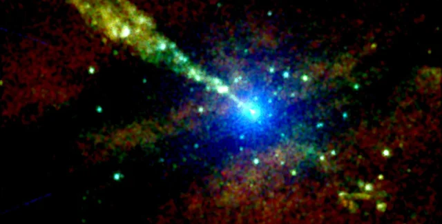 Астрономы использовали данные рентгеновского космического телескопа Чандра, чтобы подробнее изучить высокоэнергетическую струю частиц, которую выбрасывает в космос сверхмассивная черная дыра в центре галактики Центавр А. Эти релятивистские струи уже давно известны астрономам, но они очень плохо изучены и таят в себе много секретов. Предполагается, что струи из плазмы образуются результате взаимодействия магнитных полей черной дыры и ее аккреционного диска, то есть диска из горячей материи, которую притянула к себе черная дыра и постепенно поглощает. Исследование опубликовано в The Astrophysical Journal, пишет Phys.