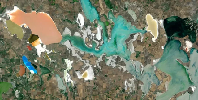 "Гнилое озеро" — разобранная радуга из примерно дюжины разноцветных лагун — занимает центральное место в потрясающем спутниковом снимке, сделанном около 10 лет назад, в 2014 году. На кадре видно разнообразие цветов от малинового, персикового и горчичного до лаймово-зеленого, бежевого и ярко-синего. Все эти удивительные разноцветные особенности обусловлены несколькими факторами, в том числе и микроорганизмами, обитающими в лагунах, пишет Live Science.