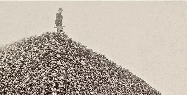 Черепа на фотографии не просто символизируют потерю бизонов, но и разрушение целой экосистемы. Каждый убитый бизон означал конец выпаса, валяния и миграции, которые делают землю гостеприимной для других видов.