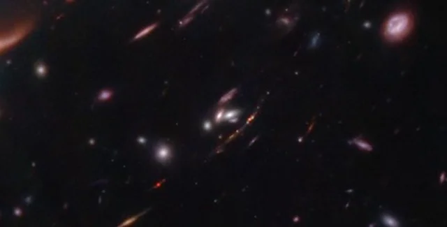 Через пару сотен миллионов лет после рождения Вселенной материя активно начала собираться вместе, чтобы образовать первые звезды и галактики. Но увидеть самые ранние галактики очень сложно, ведь они находятся очень далеко от нас. Для этого астрономы используют гравитационное линзирование. В данном случае в качестве гравитационной линзы, которая усилила свет очень далекой галактики выступало огромное скопление галактик, расположенное на расстоянии 5,3 млрд световых лет от нас. Это скопление с помощью своей гравитации усилило свет далекого объекта, но в то же время исказило его, а потому галактика Firefly Sparkle имеет на снимке форму длинной полосы света. Хотя на самом деле ее форма другая.