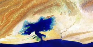 Спутник Земли запечатлел приливную лагуну, полную воды и расположенную в самом центре засушливой пустыни Пакистана.