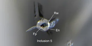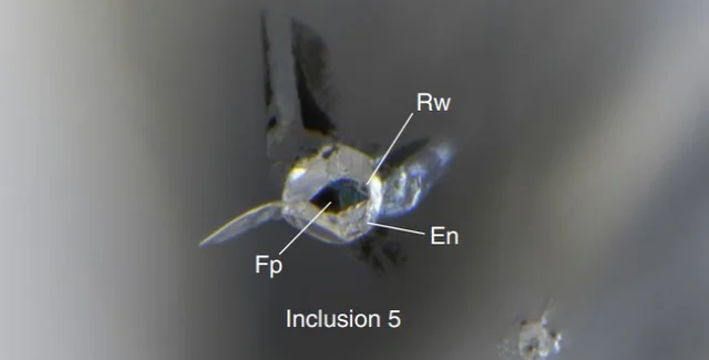 В ходе исследования Гу с коллегами подробно изучили этот особенный алмаз и обнаружили 12 минеральных включений и молочно-белое скопление включений. Далее команда использовала микрорамановскую спектроскопию и рентгеновскую дифракцию, что помогло определить их природу. Среди включений они обнаружили совокупность рингвудита (силиката магния) в контакте с ферропериклазом (оксид магния/железа) и энстатитом (еще один силикат магния с другим составом).