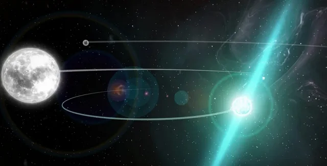 Пульсар вращается вокруг общего центра масс вместе с белым карликом по 1,6-дневной орбите, но обе мертвые звезды вращаются вокруг другого белого карлика по 327-дневной орбите.