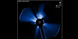 Спутник GOES-19 делает снимки короны Солнца, то есть самого верхнего слоя атмосферы звезды, с помощью коронографа CCOR-1. Он виден на фотографии как темный круг, который блокирует самый яркий свет Солнца.