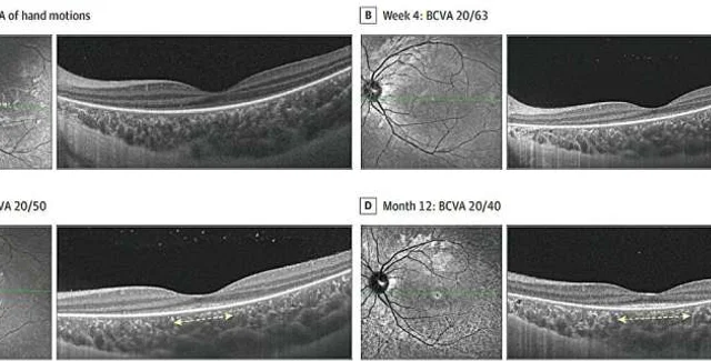 Несмотря на первоначально низкую остроту зрения, большинство пациентов продемонстрировали улучшение центрального зрения в течение года. Однако визуализация сетчатки выявила нарушения в эллипсоидной зоне и внешней ограничительной мембране, тогда как электроретинография (ERG) показала полную потерю реакций фоторецепторов, даже в случаях восстановления зрения.
