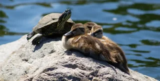 Исследователи впервые в истории заметили, как красноухие черепахи в пруду нападают на крохотных утят.