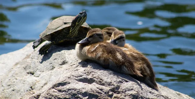 Красноухая черепаха неожиданно напала на утят | Фото: Shutterstock