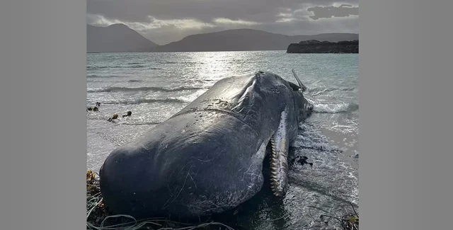 Исследователи запечатлели гибель кашалота, который запутался в веревках и выбросился на мель на шотландском острове.