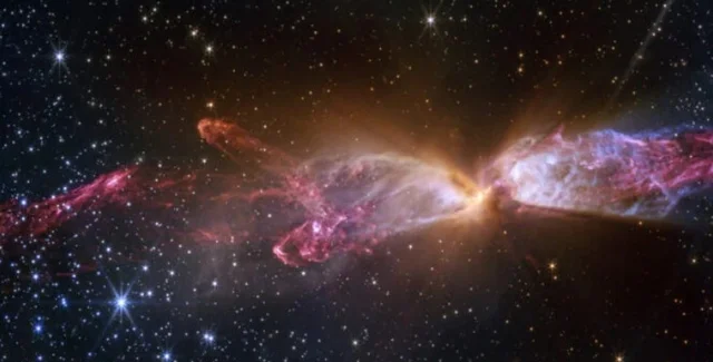 Космический телескоп Уэбб сделал фотографию эпической битвы между двумя протозвездами, когда они запускают струи вещества друг на друга, создавая картину столкновения газа и пыли в форме песочных часов. Эта космическая битва, которая длится уже тысячи лет, закончится через несколько миллионов лет, когда две протозвезды завершат свое формирование, пишет Gizmodo.