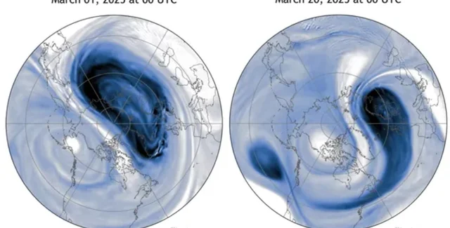 Прошлогоднее стратосферное потепление нанесло существенный удар по полярному вихрю, изменив направление его ветров уже в начале марта, но вихрь тогда восстановился.