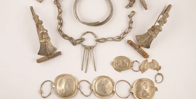 Недавно найденный клад содержит шесть различных серебряных изделий: круглый браслет с ботаническим орнаментом, три фибулы (две узловатые и одна с четырьмя узлами), цепочку с подвесками в форме гвоздей и пояс, составленный из соединенных овальных пластин.