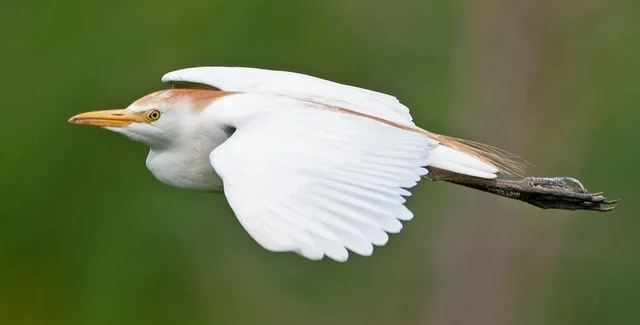 По размеру египетская цапля небольшая: ее длина — до полуметра, а размах крыльев — до метра. В основном покрыта белыми перьями, но на голове, спине и зобе имеет бежево-желтоватый оттенок.