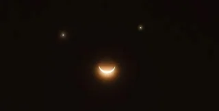 В пятницу утром рядом с друг другом появятся Венера и Сатурн, а рядом сними будет находится Луна, которая не полностью освещена Солнцем и потому будет видна в виде полумесяца. То есть две планеты должны образовать "глаза", а Луна — "улыбку" на космическом "лице".