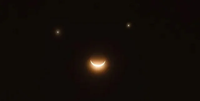 Астрономы говорят, что при ясном небе, если посмотреть на восток, то вблизи горизонта должно быть заметно тройное соединение Луны, Венеры и Сатурна. Когда два астрономических объекта появляются на близком расстоянии друг другу в ночном небе, то это называется соединением. Если же сразу три астрономических объекты находятся в таком положении, то это называется тройным соединением.