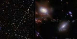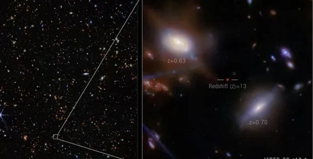 Более 13,5 млрд лет назад галактика JADES-GS-Z13-1-LA выпустила яркое ультрафиолетовое излучение, но когда этот свет преодолел миллиарды световых лет, пока галактику не обнаружил космический телескоп Уэбб, его волны растянулись. В результате ультрафиолетовый свет далекой галактики стал инфракрасным светом. Из-за этого его смог увидеть телескоп Уэбб, который наблюдает за ранней Вселенной с помощью инфракрасных приборов.