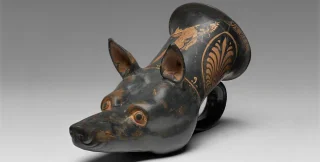 Считается, что кубок в форме ритона, церемониального кубка для питья, который сейчас хранится в коллекции Музея Гетти в Лос-Анджелесе, происходит из мастерской так называемого Дария Живописца, известного вазописца, работавшего в Апулии между 340 и 320 годами до н. э. Сосуд размером примерно 20 на 10 сантиметров покрыт черной глазурью, за исключением ушей, ноздрей и глаз собаки, которые прорисованы разведенной глазурью.