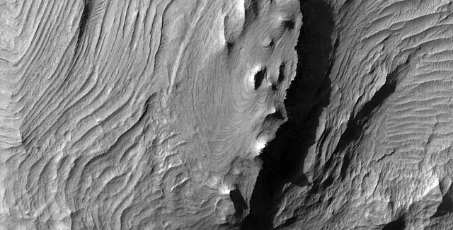 Камера HiRISE имеет очень высокое разрешение и позволяет видеть много деталей на поверхности Красной планеты. На новом изображении видны слоистые отложения осадочного материала толщиной в несколько метров. Важно отметить, что эти слои осадочного материала должны датироваться временем после образования самого каньона, поскольку они, по-видимому, были деформированы тектоническими движениями.