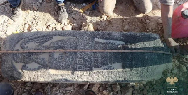 В древнем городе Манбидж, Сирия, нашли высеченную из черного базальта стелу римской эпохи. Памятник, возраст которого оценивается примерно в 2000 лет, украшен изображением орла, держащего венок, и греческими надписями.