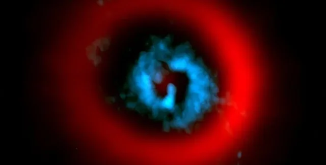 Изображение пылевого кольца (красное) и газовых спиральных рукавов (синие) в протопланетном диске звезды AB Возничего указывают на формирование планет | Фото: Live Science
