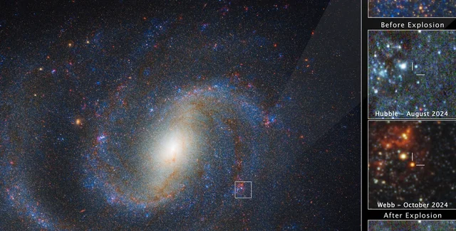 В июне этого года астрономы обнаружили в галактике NGC 1637, на расстоянии 40 млн световых лет от нас, сверхновую, получившую название SN 2025pht. Оказалось, что телескоп Уэбб запечатлел еще в 2024 году звезду, которая создала эту сверхновую.