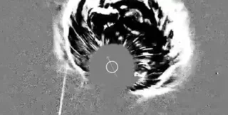 Но коронограф CCOR-1, установленный на борту метеорологического спутника GOES-19, блокирует яркий диск Солнца, чтобы запечатлеть корональные выбросы массы по мере их расширения в космос.