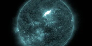 Солнечная вспышка — это интенсивный выброс энергии на Солнце, вызванный внезапным высвобождением магнитной энергии в активном регионе с солнечными пятнами. Во время вспышек в космос улетает излучение и поток заряженных частиц, которые могут нарушить связь на Земле, если проникнут в атмосферу планеты.