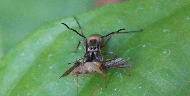 Речь идет о пауках-скакунах, также известных как пауки, подражающие муравьям (Toxeus magnus). Исследователи заметили, что гнездо этого вида довольно необычно в сравнении с другими, более одиночными пауками. Как правило, в нем обитали несколько взрослых и несколько молодых особей, что нетипично для вида, который, как считалось, не живет колониями.