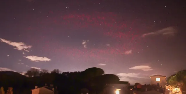 На долю секунды над северной Италией в ночном небе появилось огромное светящееся красное кольцо. Один фотограф оказался в нужном месте в нужное время, пишет Space.