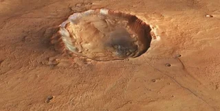 На фотографии, сделанной орбитальным аппаратом Mars Express Европейского космического агентства (ЕКА), запечатлен слегка овальный кратер размером примерно 20 километров с востока на запад и около 15 километров с севера на юг
