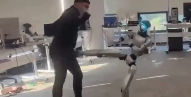 В соцсети попало забавное видео, на котором инженер, тестирующий человекоподобного робота, получил от машины удар в пах.