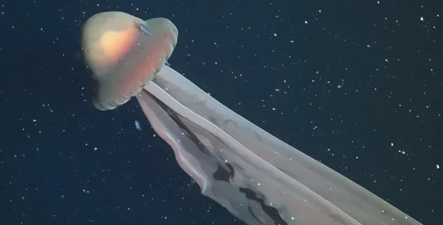 Исследователи поделились редкими кадрами гигантской призрачной медузы, достигающей в длину около 10 метров. За всю историю наблюдений ученые встречали этих обитателей морей всего около 100 раз.