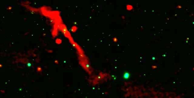 Это изображение показывает яркую струю из плазмы, указывающую на пробуждение некогда спящей сверхмассивной черной дыры в центре гигантской галактики J1007+3540