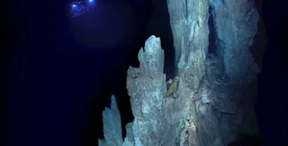 Вблизи вершины подводной горы к западу от Срединно-Атлантического хребта из темноты возвышается изрезанный ландшафт башен, не похожий ни на что виденное ранее на планете.