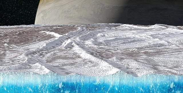 Художественное изображение ледяной поверхности Европы и подземного океана на спутнике Юпитера | Фото: phys.org