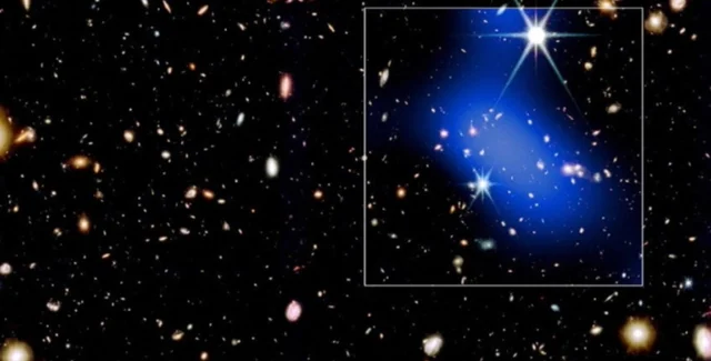 Формирующееся скопление галактик, которое существовало уже через 1 миллиард лет после Большого взрыва. Синим цветом показано рентгеновское излучение горячего газа