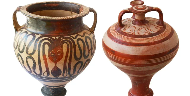 Среди находок были микенская керамика с материковой Греции, минойские сосуды с Крита, египетская слоновая кость и кальцит, лазурит из Афганистана, сердолик из Индии и янтарь из Балтийского региона.
