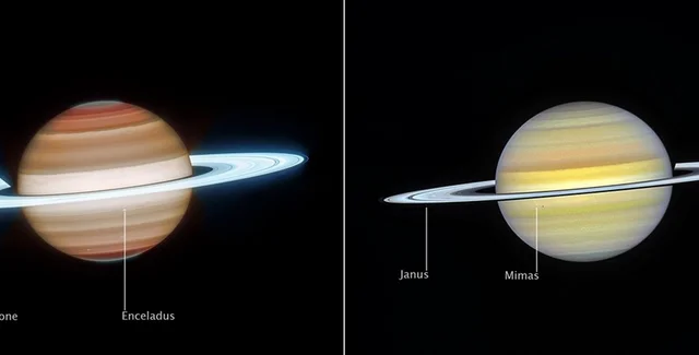 Новые фотографии, сделанные космическими телескопами Хаббл и Уэбб демонстрируют особенности насыщенной атмосферы Сатурна. Изображение Хаббла, сделанные в видимом свете, оказывают тонкие полосы облаков и цветовые вариации, в то время как инфракрасные данные Уэбба показывают различные слои атмосферы Сатурна, и позволили исследовать атмосферные штормы и светящиеся кольца с поразительной детализацией.