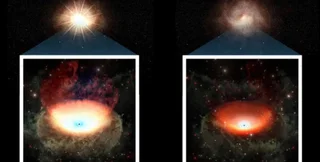 Слева: сверхмассивная черная дыра во время своей активной фазы питания. Справа: та же черная дыра после прекращения поступления пищи. Иллюстрация | Фото: space.com