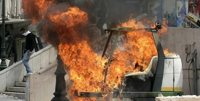 Вчера днем демонстрации в центре Афин, в которых приняли участие десятки тысяч человек, переросли в массовые беспорядки. Демонстранты забрасывали полицию камнями и пустыми бутылками. Позже пошли в ход и "коктейли Молотова".