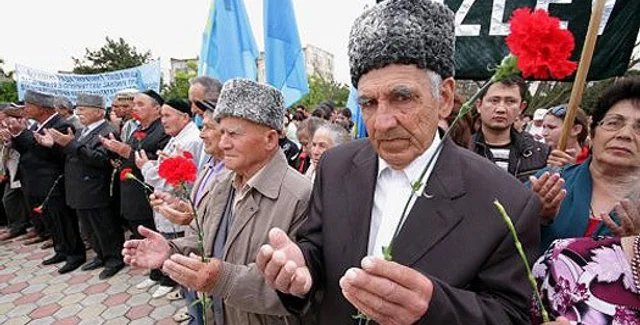 Колонны крымских татар с флагами и транспарантами прошли от окраин Симферополя к центру города, где был организован траурный митинг. Сегодня исполняется 66 лет со дня принудительного переселения крымских татар из Крыма в Среднюю Азию.