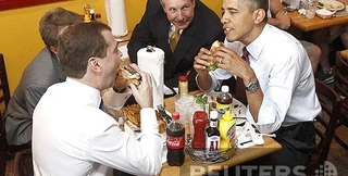 6. "Давно не ел гамбургеров", – признался в блоге Дмитрий Медведев после встречи с Бараком Обамой (фото 3). По завершении официальных переговоров глава Белого дома предложил коллеге перекусить в заведении Ray"s Hell Burger ("Адские гамбургеры от Эдда"). Выстояв очередь, президенты взяли на двоих картофель фри и по большому бургеру с сыром чеддер. Из напитков Обама выбрал холодный чай, а Медведев – кока-колу. Как сообщают СМИ, за все заплатил Обама, Медведев лишь пожал руку обслужившему их кассиру.