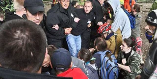 По словам представителей экологической группы "Печенеги", жители палаточного городка остановили на дороге два КрАЗа и бульдозер.