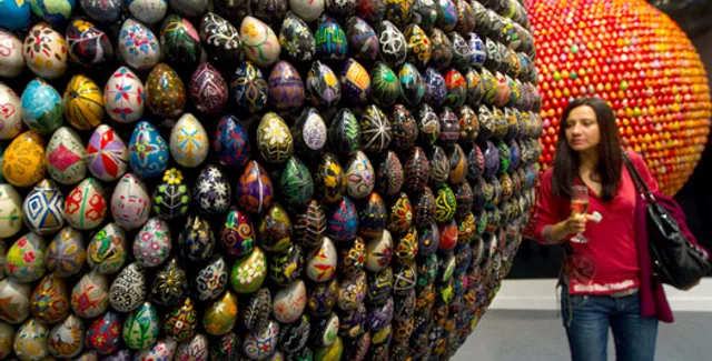 "Сделай мне портрет – голова с яйцами", – просит приятеля с фотокамерой бородатый мужчина и позирует на фоне блестящего автомобильного диска, на который вместо шины натянута сфера из пестрых украинских писанок. Вообще‑то произведение называется "Конституция" и висит на стенде MironovaGallery. Его автор – одесситка Оксана Мась, а главная идея – объединение западных стандартов и национальной уникальности. Всего колес четыре, разного цвета, цена каждого – $ 20 тыс., и по итогам "Арт-Москвы" они уже нашли покупателей.