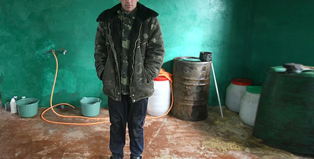 "Утром и вечером, значит, заливаю по двадцать килограммов навоза вот сюда", – демонстрирует бетонную яму с характерным запахом обслуживающий установку Леонид Дмитрук.