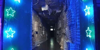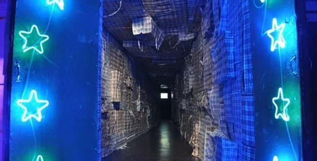 Интересна арт-работа Алексея Хорошко и Сергея Петлюка, в которой авторы представляют "клетчатую сумку" как художественный объект в экстерьере. Это символический вход-коридор на выставку.